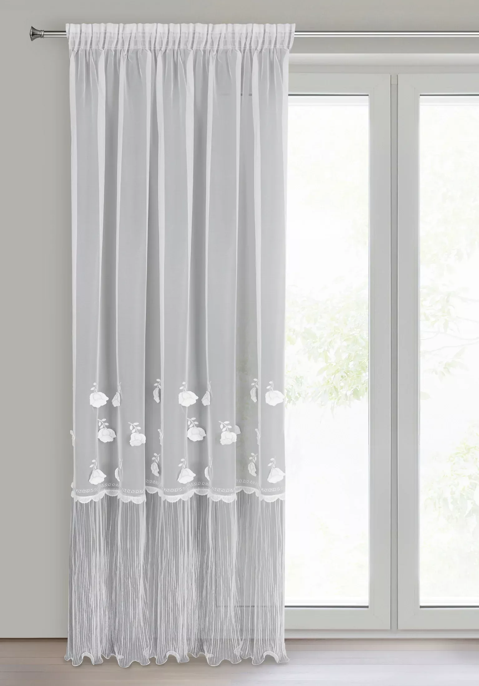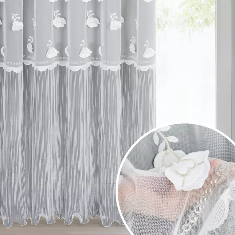 Firana zachwyca dekoracyjną aplikacją w kwiaty, która nadaje jej wyjątkowego charakteru, a falbana w dolnej części dodaje lekkości i stylowego wykończenia. Dzięki wszytej taśmie marszczącej, firana doskonale się układa.