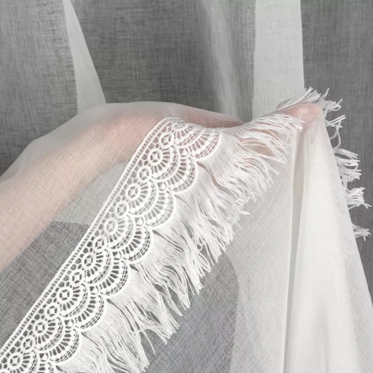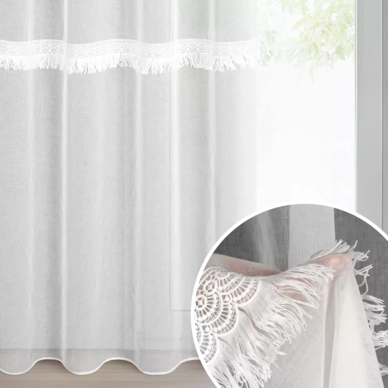 Firana gotowa ROXANA uszyta z gładkiej, matowej etaminy, prezentuje się we wnętrzu zjawiskowo dzięki fantazyjnej aplikacji z gipiurą i frędzelkami. Taka dekoracja prezentuje się we wnętrzu niezwykle świeżo i romantycznie. Idealnie dopasuje się do okna w Twojej sypialni, jadalni czy też salonie, nadając wnętrzu niepowtarzalnego charakteru. Praktyczne przelotki pozwalają na szybką zmianę dekoracji okiennej, dzięki nim po zawieszeniu firana układa się w miękkie i regularne fale. Taka dekoracja, sprawdza się we wnętrzu urządzonym w stylu romantycznym oraz we wnętrzu klasycznym. Półtransparentna tkanina dobrze kryje okno, zabezpieczając wnętrze przed nadmiarem słońca, dlatego polecamy ją szczególnie do mocno nasłonecznionych wnętrz.