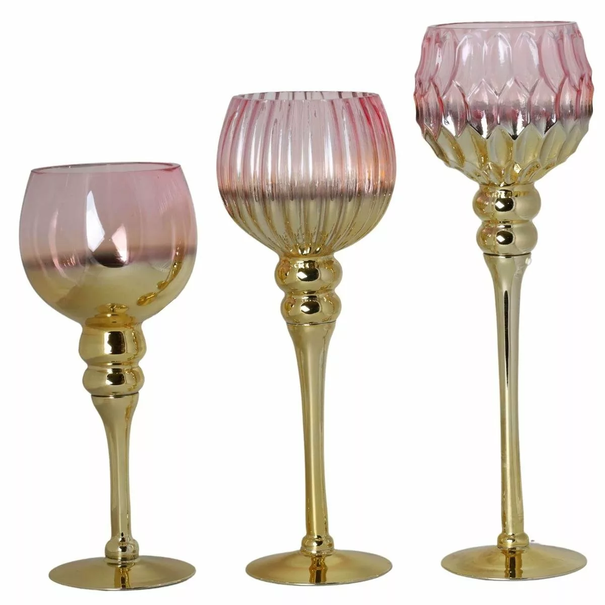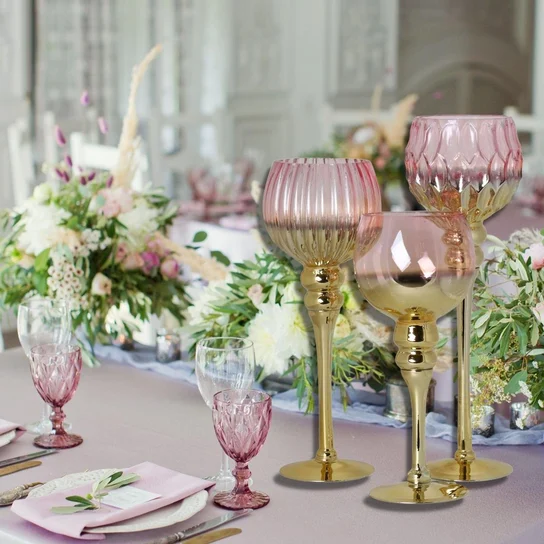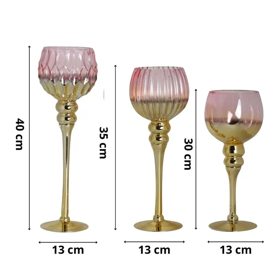Niezwykle efektowny komplet trzech szklanych świeczników na nóżce, który odmieni tradycyjne nakrycie stołu. Duże kielichy w kolorze różowo – złotym stanowią nowoczesny i praktyczny akcent dekoracyjny, który wykorzystasz na wiele sposobów tworząc niezapomniany klimat. Wysokiej jakości karbowane szkło. Szeroka stopka zapewnia stabilność. Wielofunkcyjne – posłużą jako lampion, dekoracja oraz baza do kompozycji florystycznych. Materiał: szkło, rozmiar 30-40 cm. Wysokiej jakości wykonanie gwarantuje długoletnie użytkowanie oraz satysfakcję. Zestaw trzech świeczników Idealnie sprawdzi się do dekoracji stołu czy komody tworząc miły nastrój oraz designerski aranż.