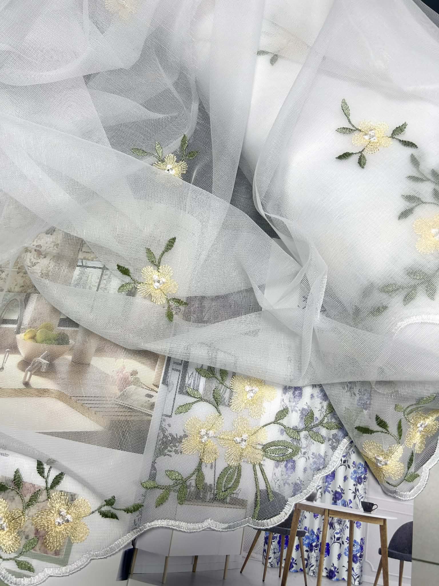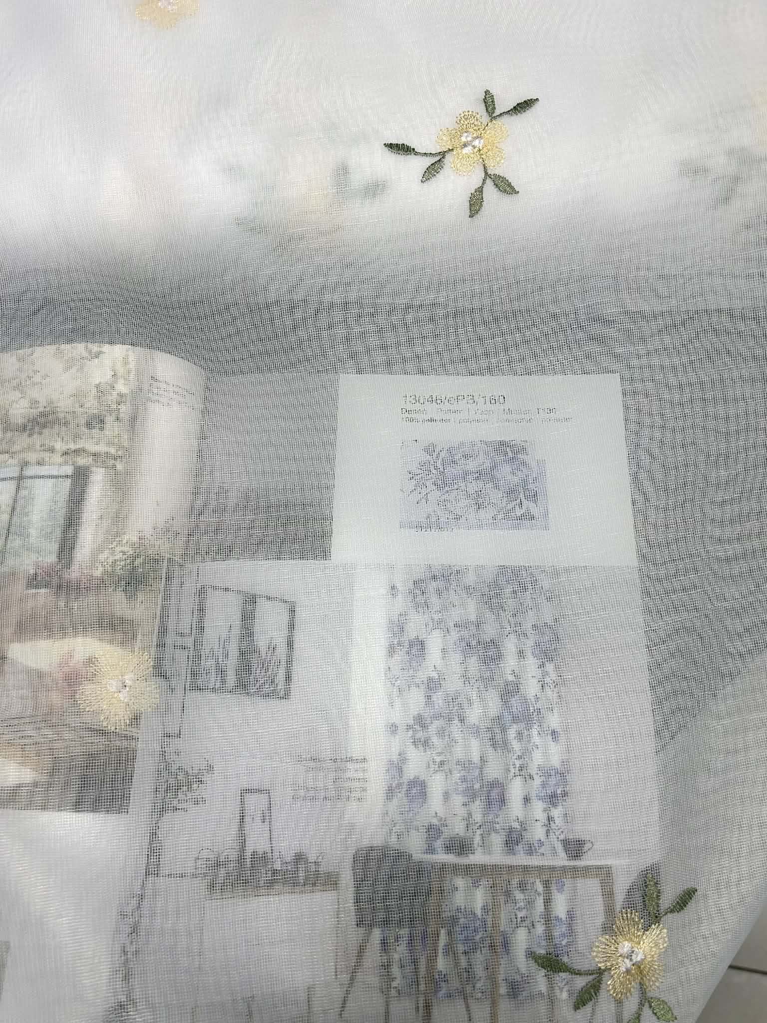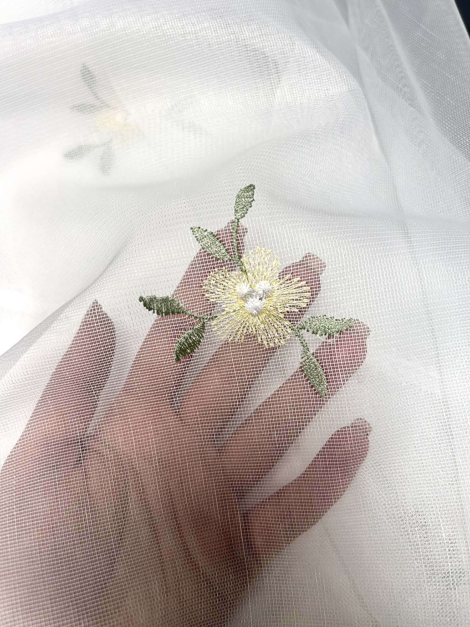 Śliczna tkanina firanowa biała na bambusie, wykończona falą z haftami po całości żółtych kwiatuszków. Wysokość firany 150cm