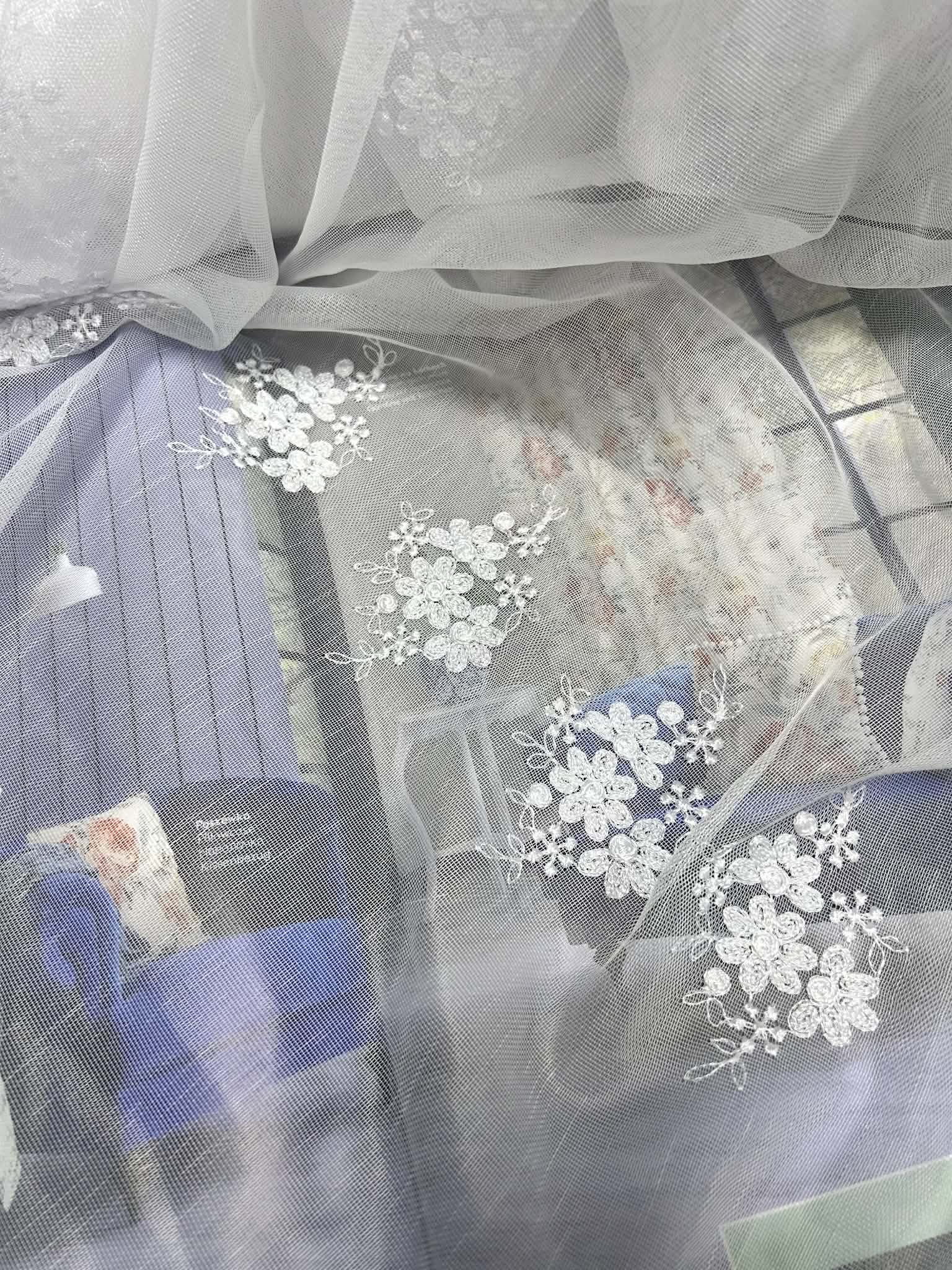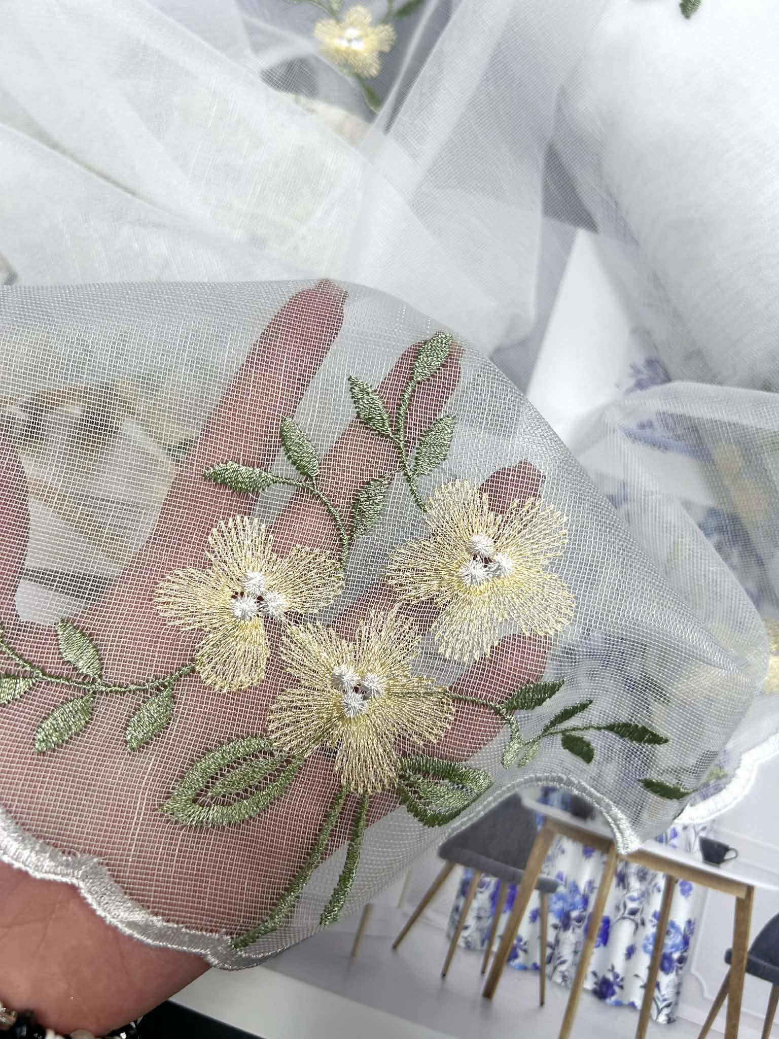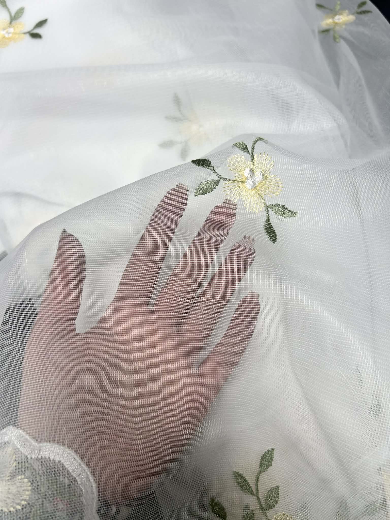Śliczna tkanina firanowa biała na bambusie, wykończona falą z haftami po całości żółtych kwiatuszków. Wysokość firany 150cm