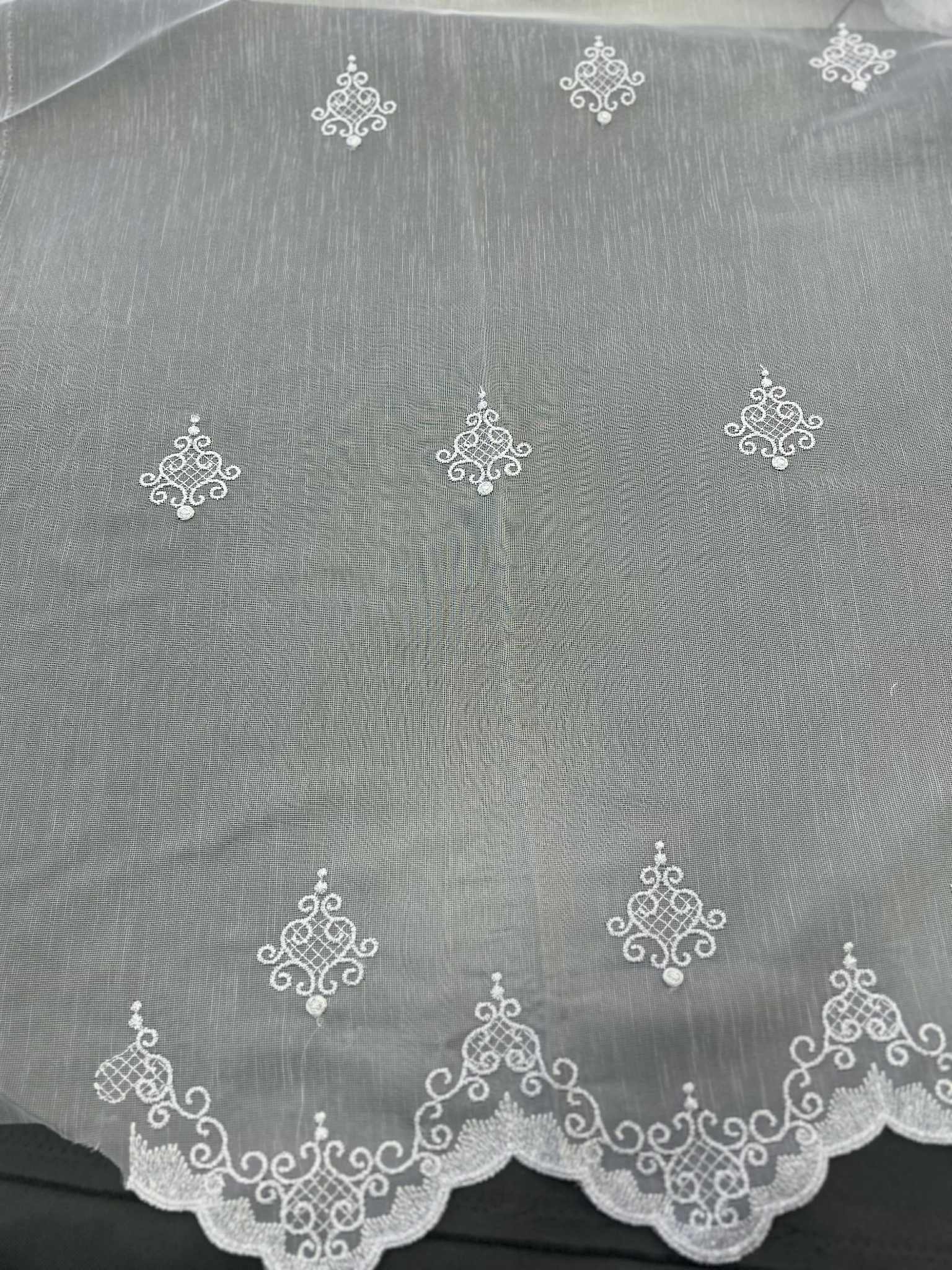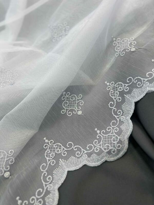 Wprowadź do swojego wnętrza wyjątkowy styl i subtelny blask dzięki tej eleganckiej firanie wykonanej z lekkiego materiału typu bambus. Firana ozdobiona jest haftem w kolorze srebrnym, który pokrywa całą jej powierzchnię – zarówno w formie delikatnych, symetrycznych wzorów, jak i bogato zdobionego dołu.