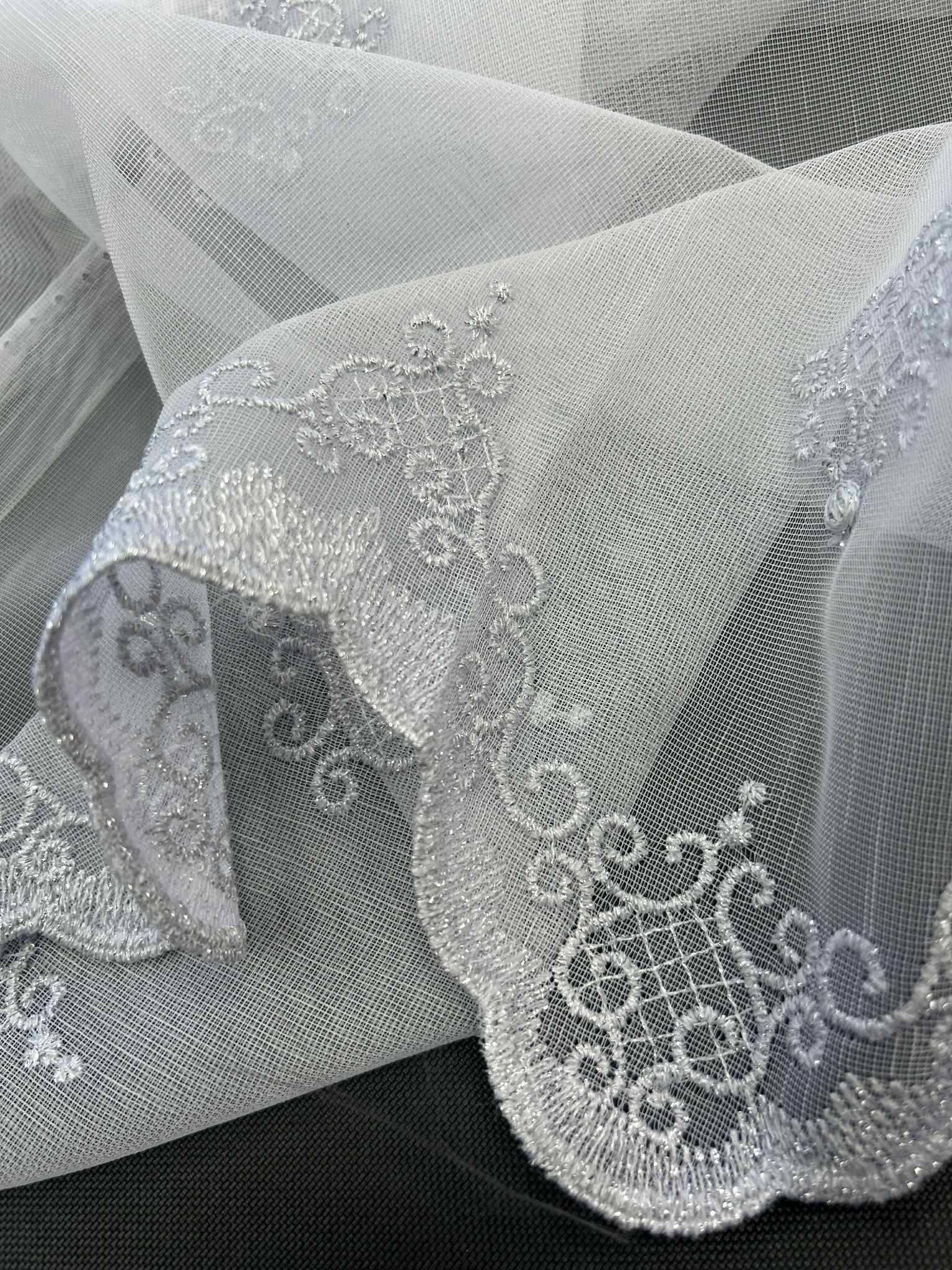 Elegancka biała firana na bambusie z srebrnym haftem