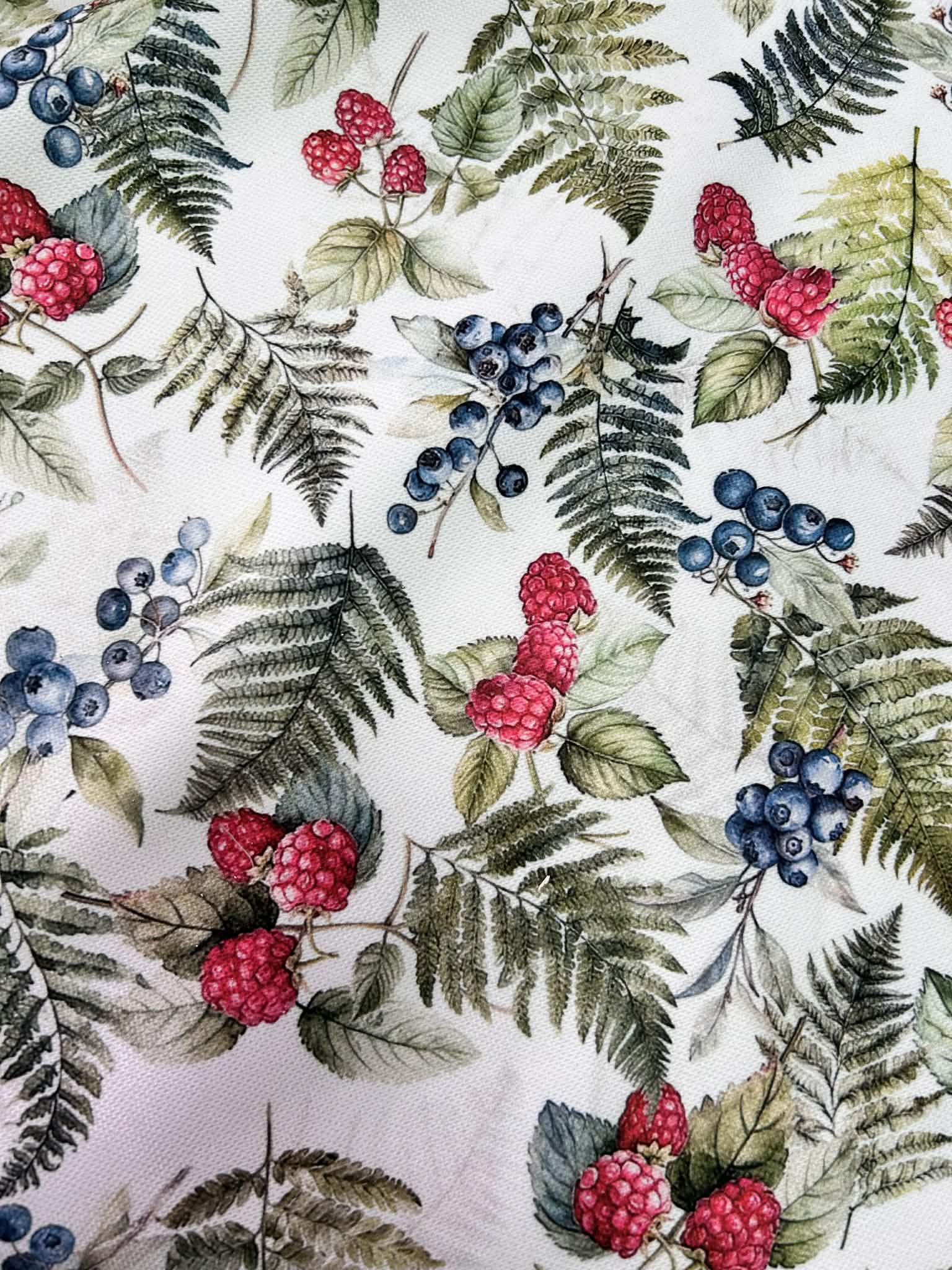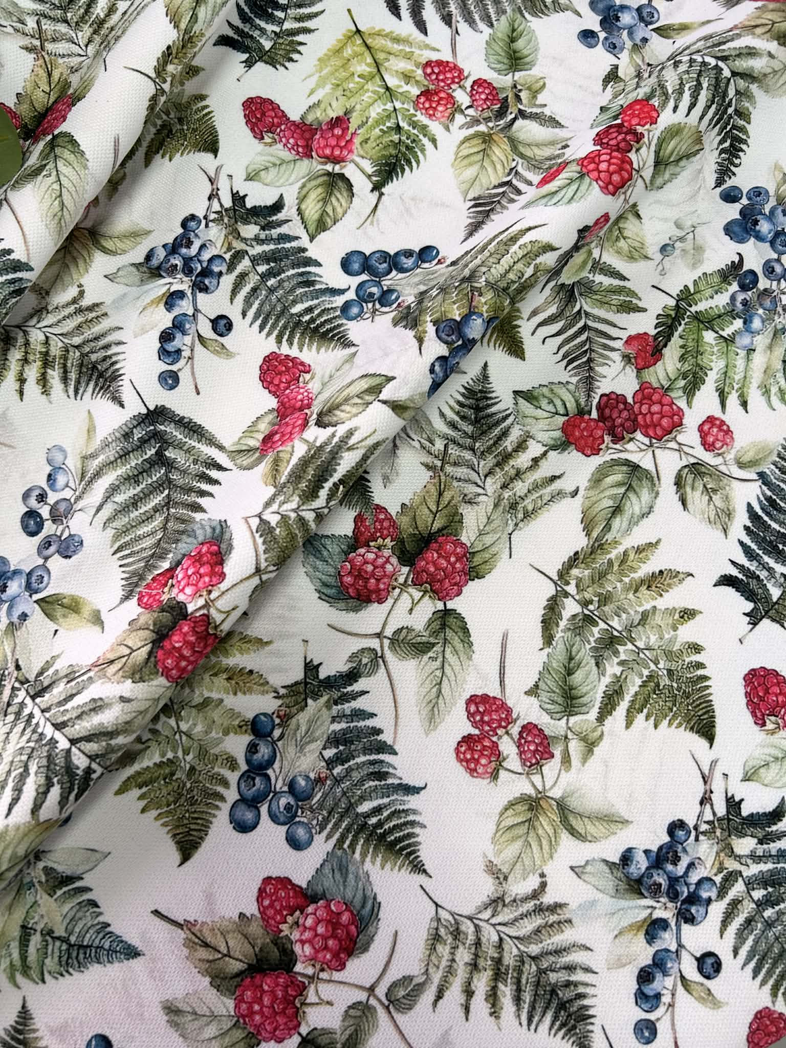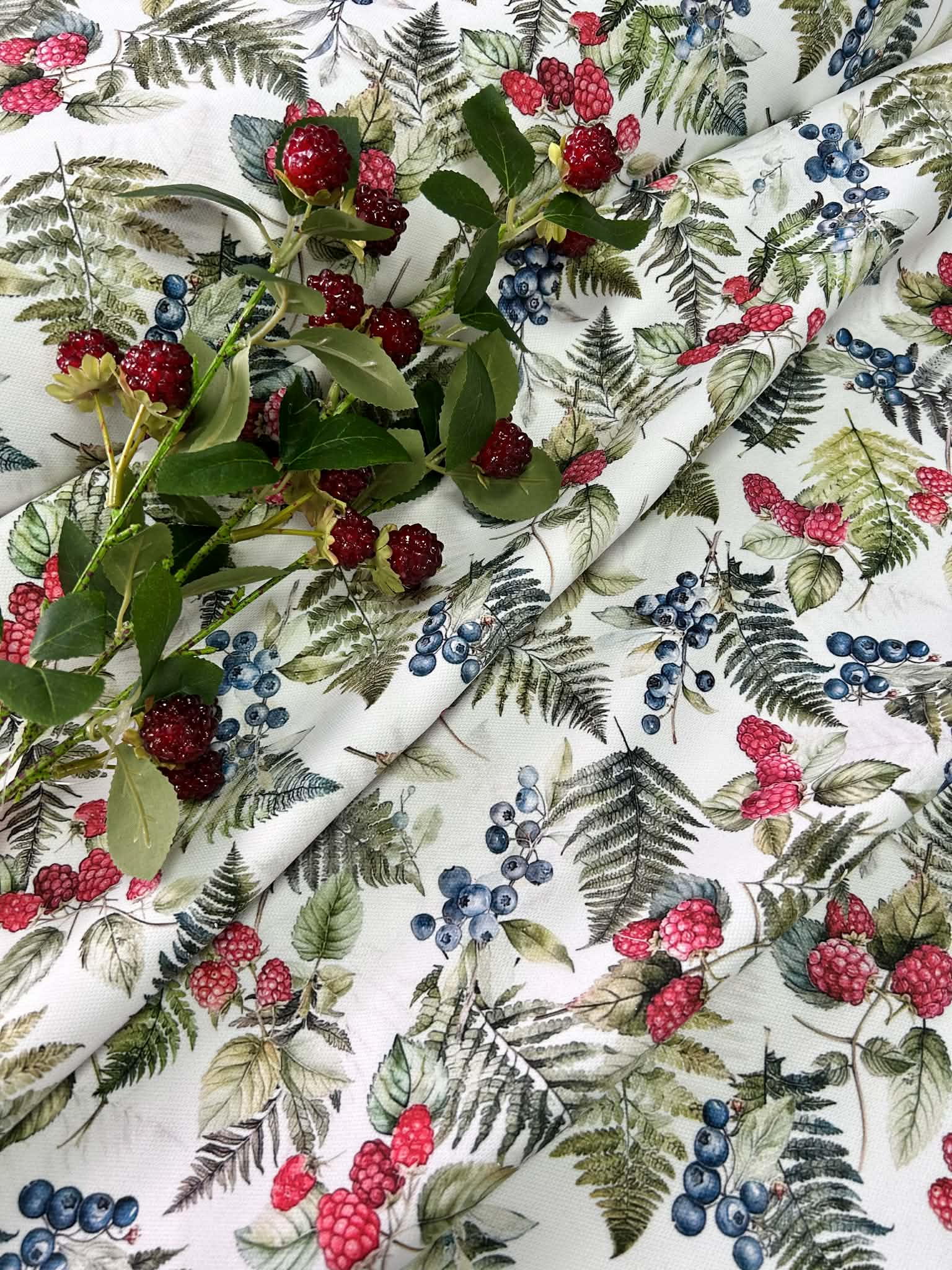 Piękna tkanina zasłonowa na naturalnym podkładzie, miękkim w dotyku w kolorze białym z motywem leśnej polany w odcieniach zieleni, granatu i czerwieni. Szerokość tkaniny 160cm, sprawdzi się zarówno na zasłony jak i poduszki czy obrusy.