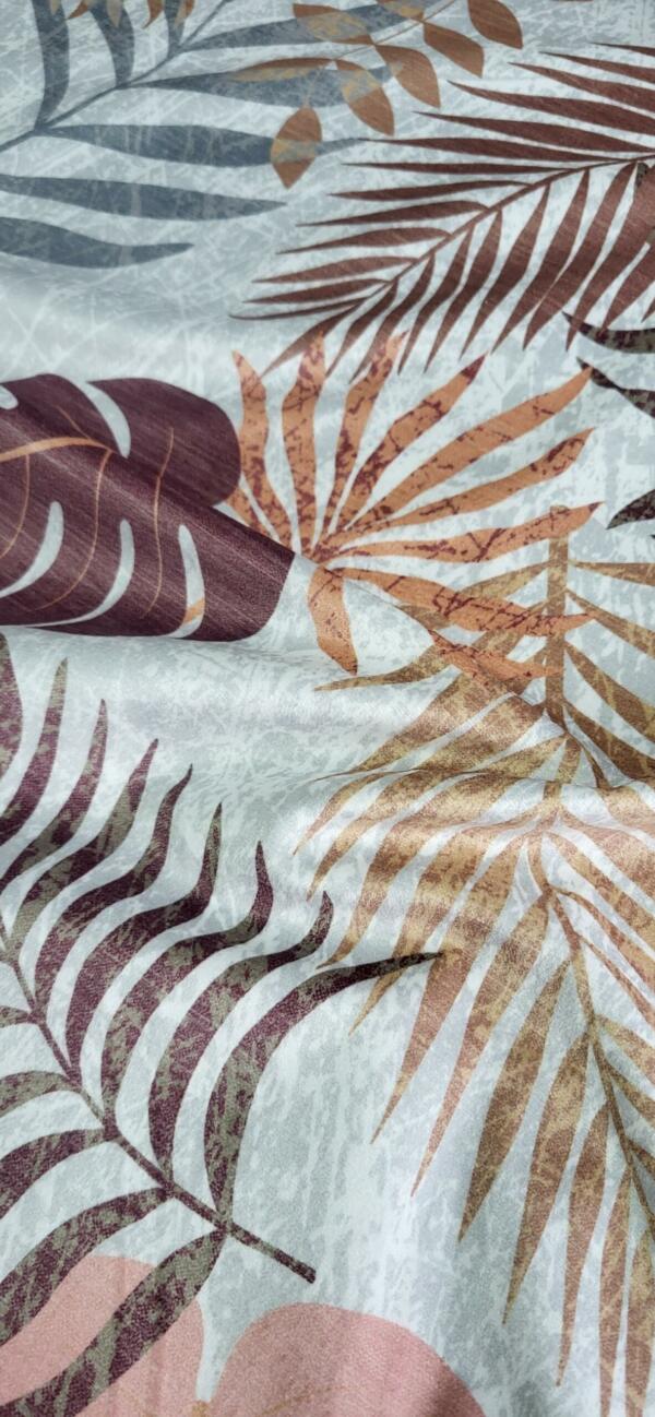 Piękna tkanina welurowa w stonowanym, eleganckim kolorze szarym, ozdobiona wyrazistym wzorem liści w ciepłych odcieniach pomarańczu, brązu i bordo – doskonała na jesienno-zimowe aranżacje, ale sprawdzi się również przez cały rok!