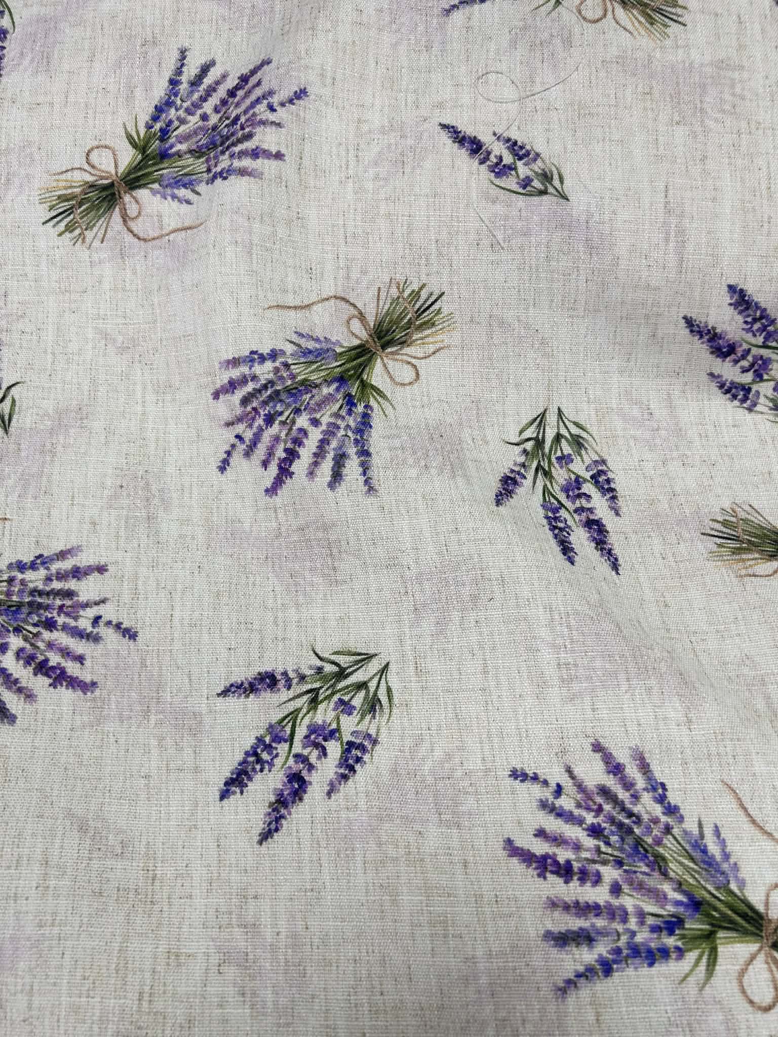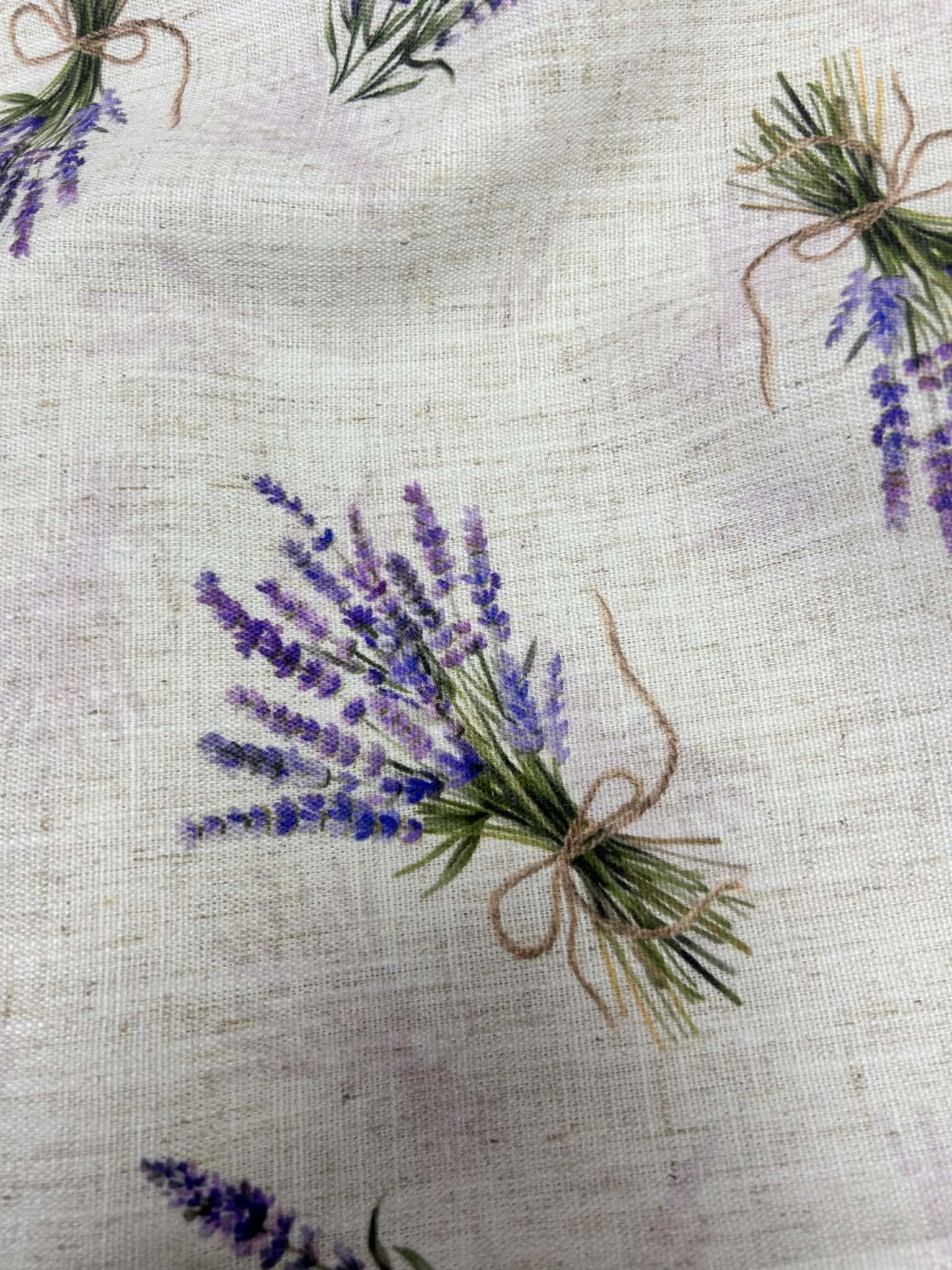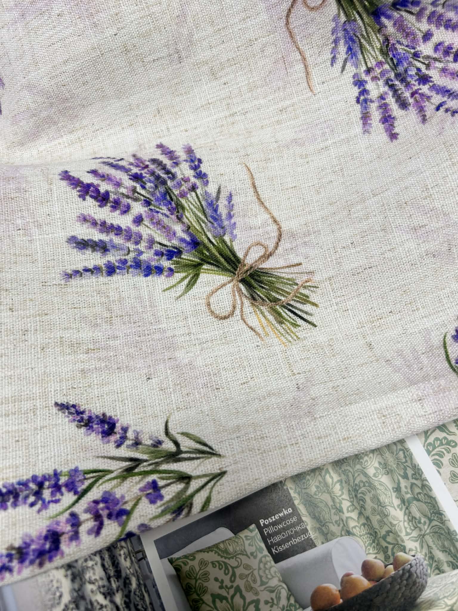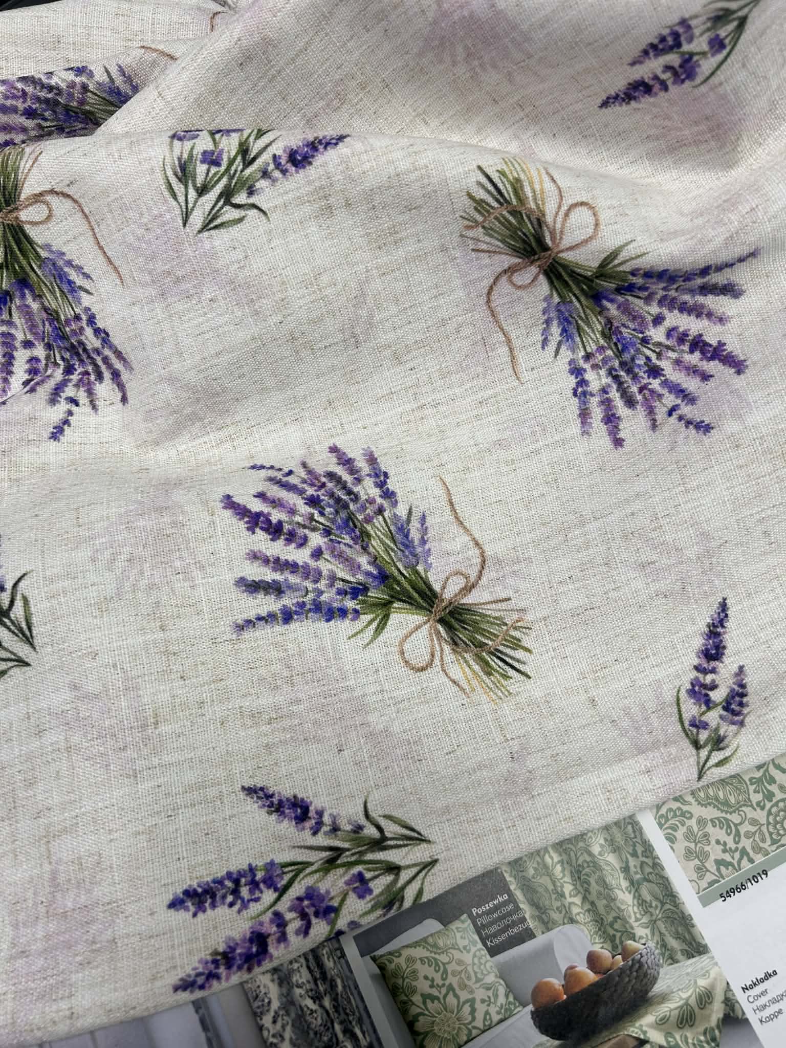 Tkanina zasłonowa na podkładzie imitującym len z motywem lawendy w kolorze fioletowym. Szerokość tkaniny 150cm, nadaje się ona zarówno na zasłony jak i na obrusy i poduszki.