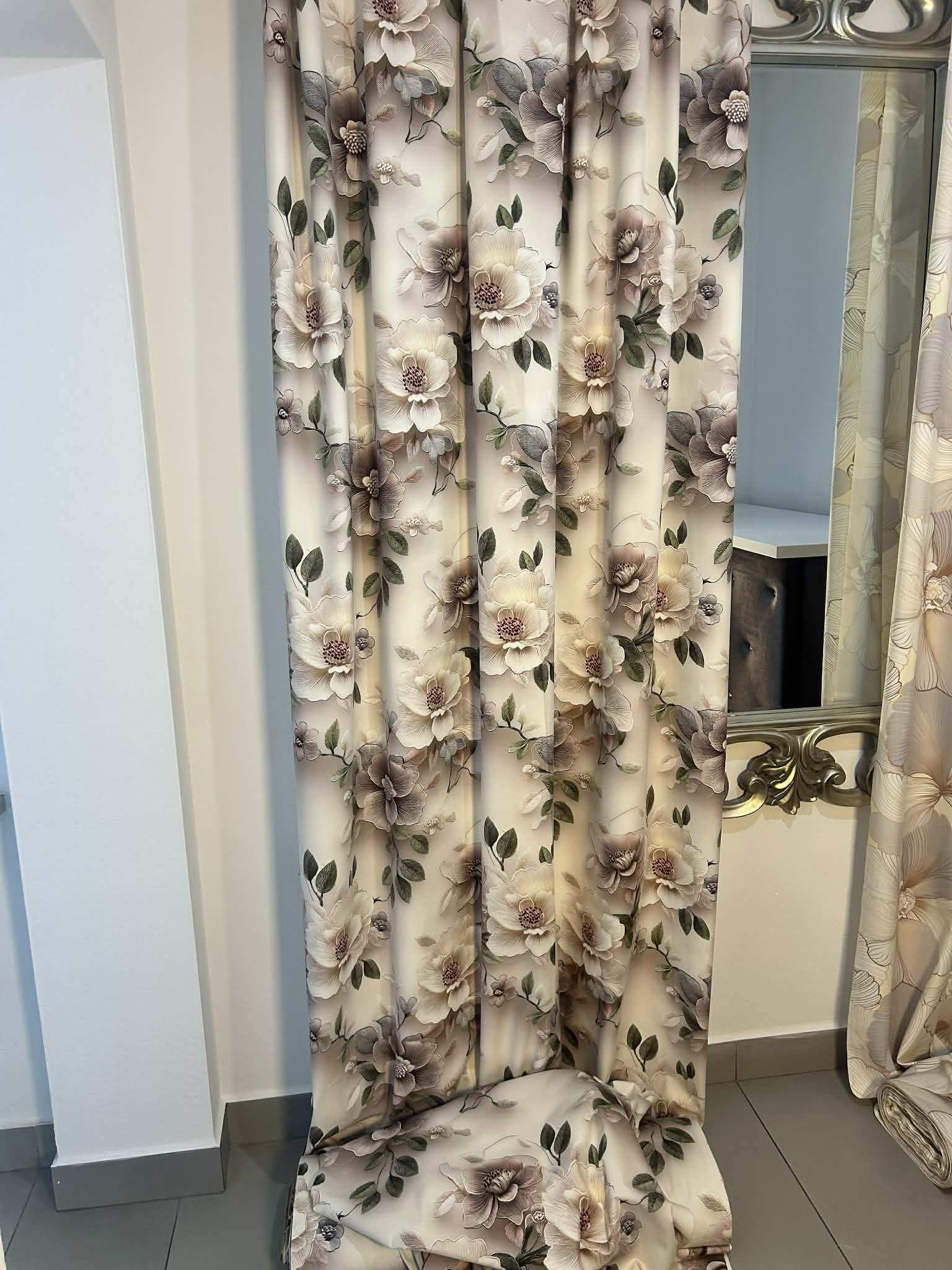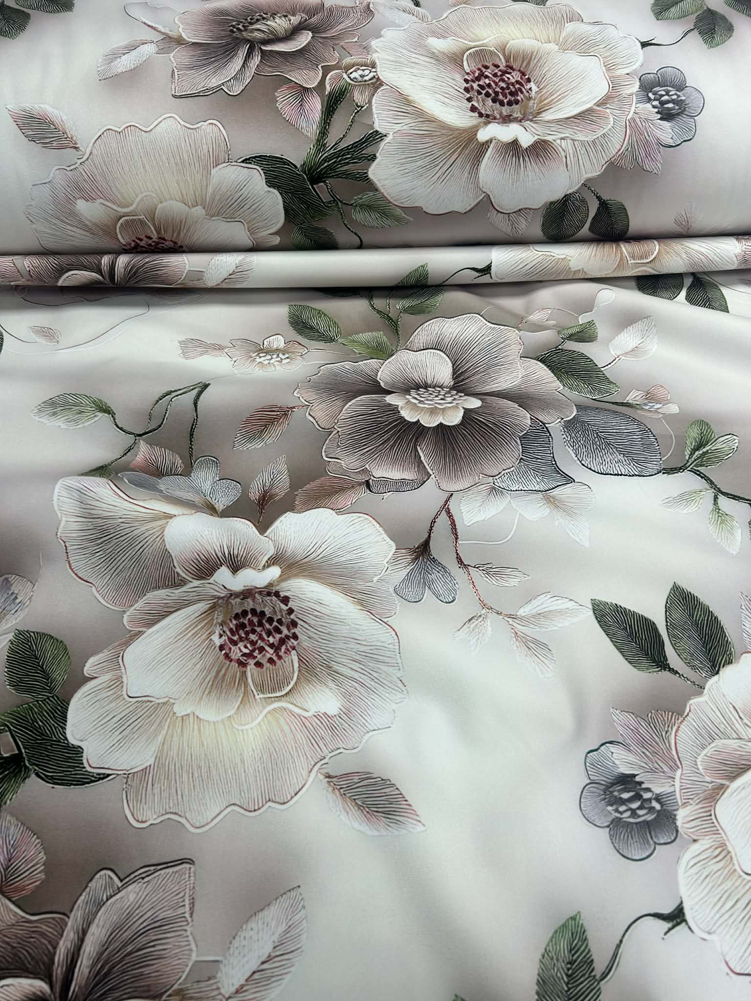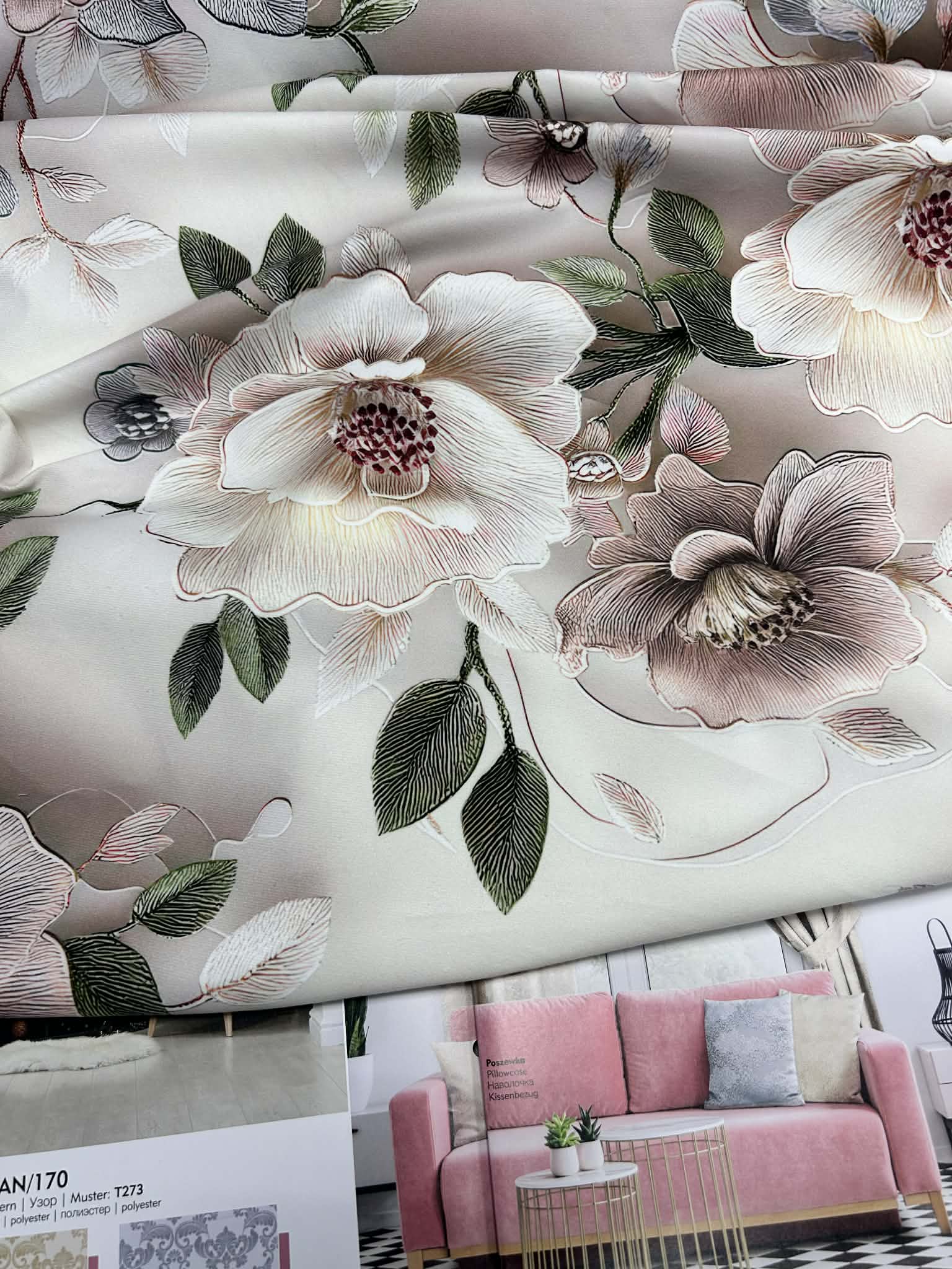 Tkanina zasłonowa velvet z motywem wyszywanych kwiatów 3D w odcieniach beżu, szerokość 150cm.
