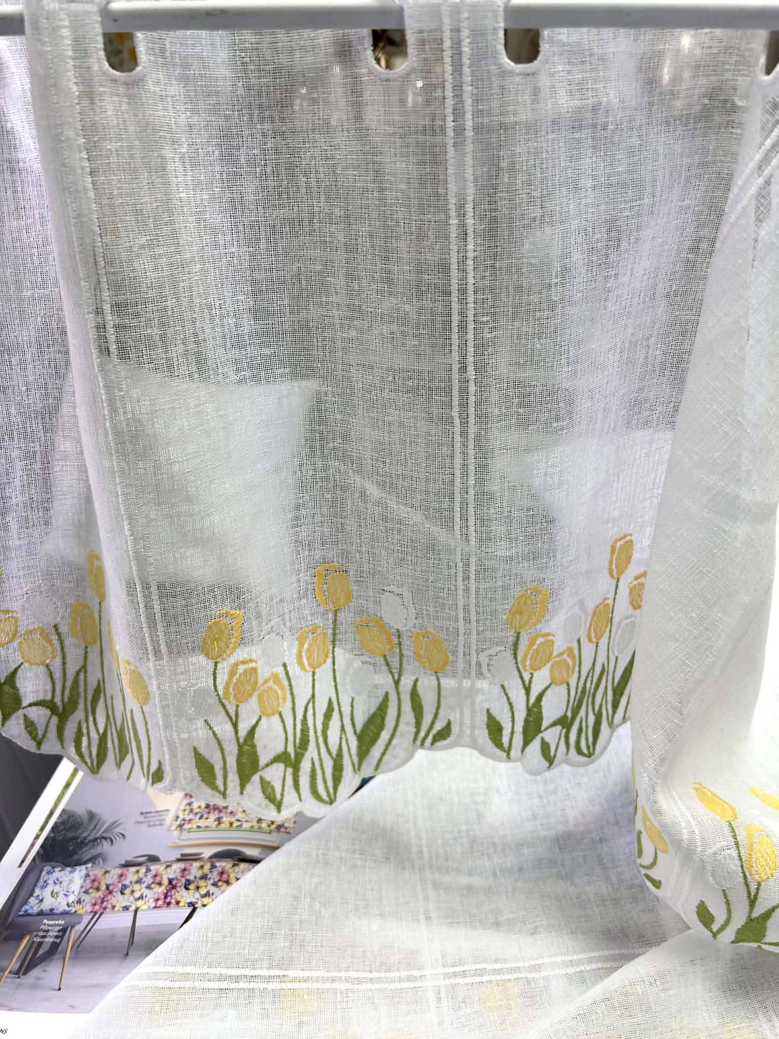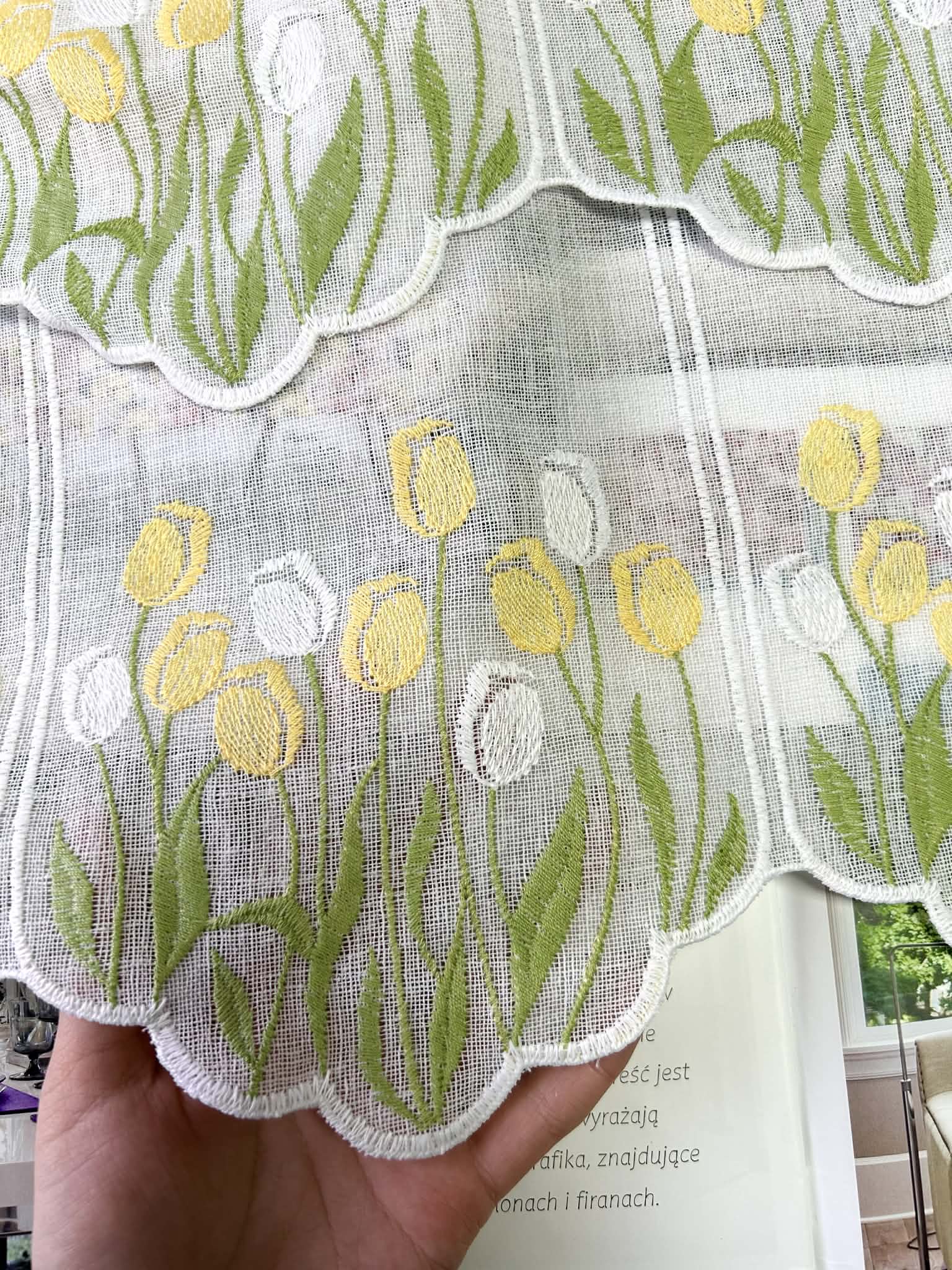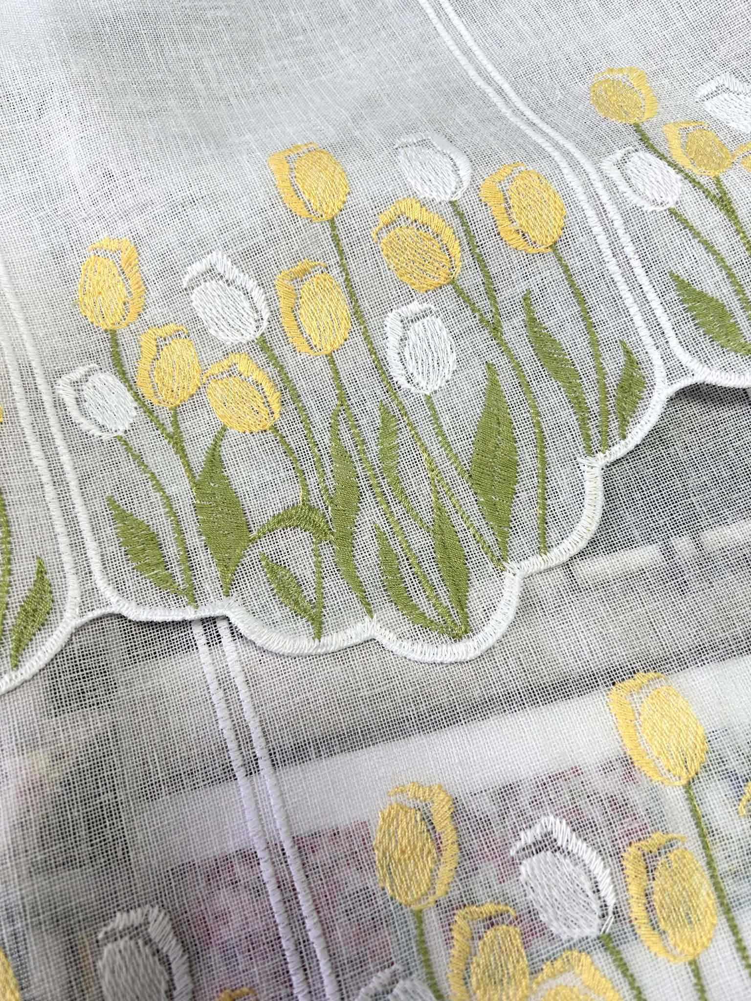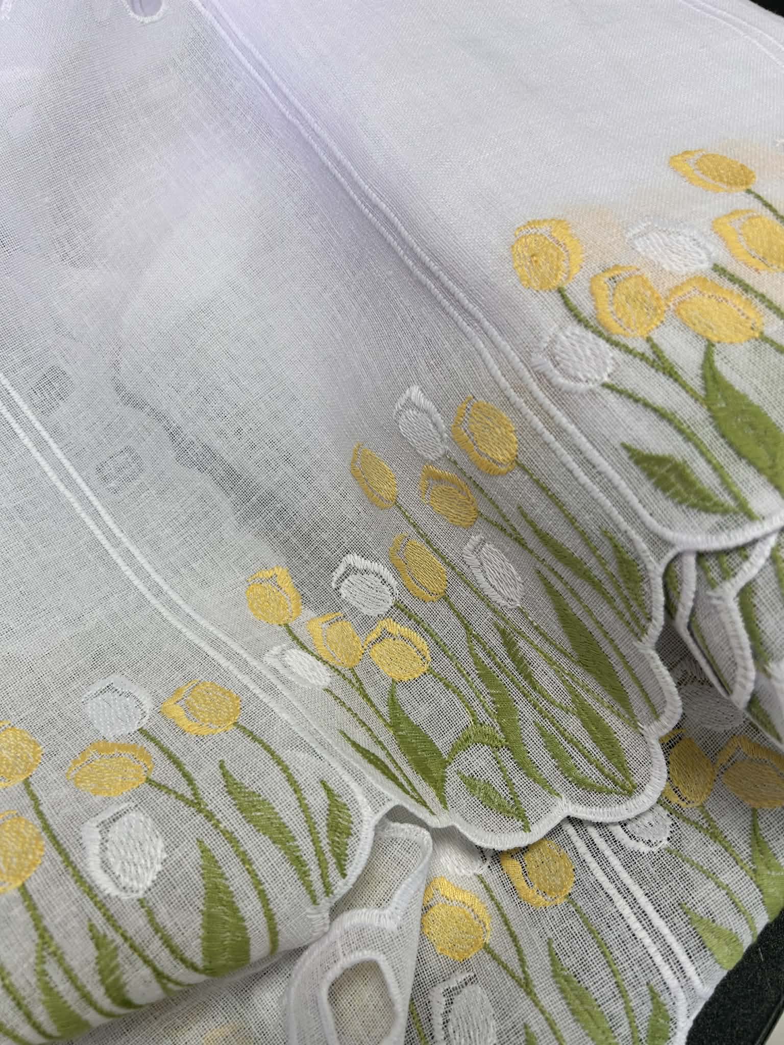 Zazdroska panelowa biała na etaminie z haftem tulipanów w kolorze żółtym i białym. Zazdroska nie wymaga obszywania.